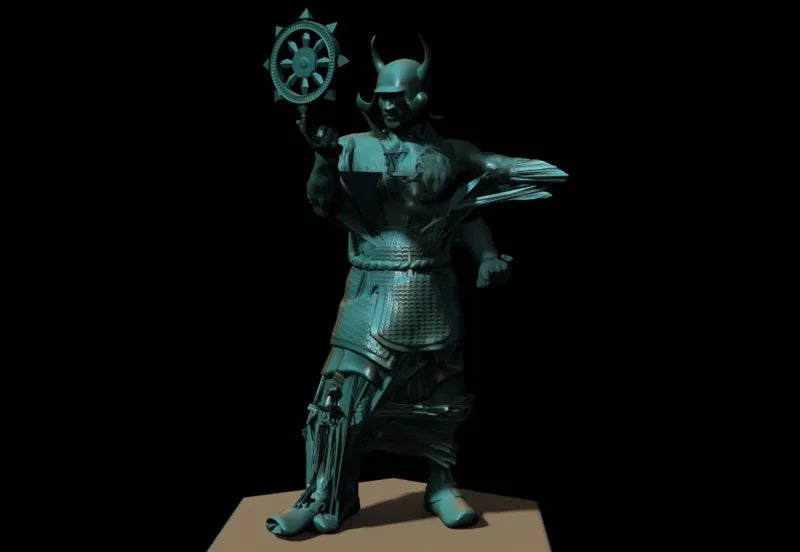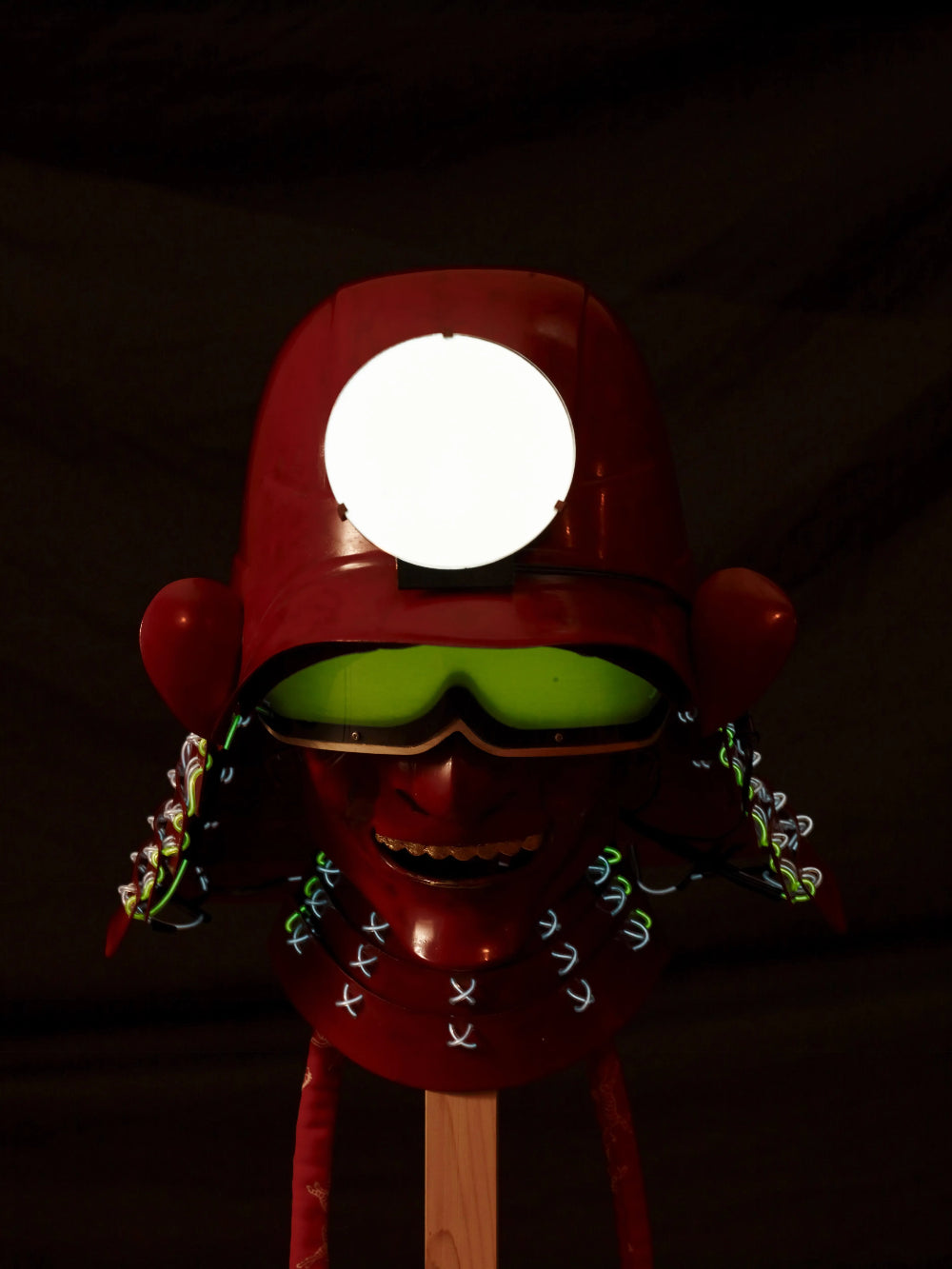 A samurai helmet sculpture illuminated with EL light.A work that merges traditional Japanese form with a futuristic presence.