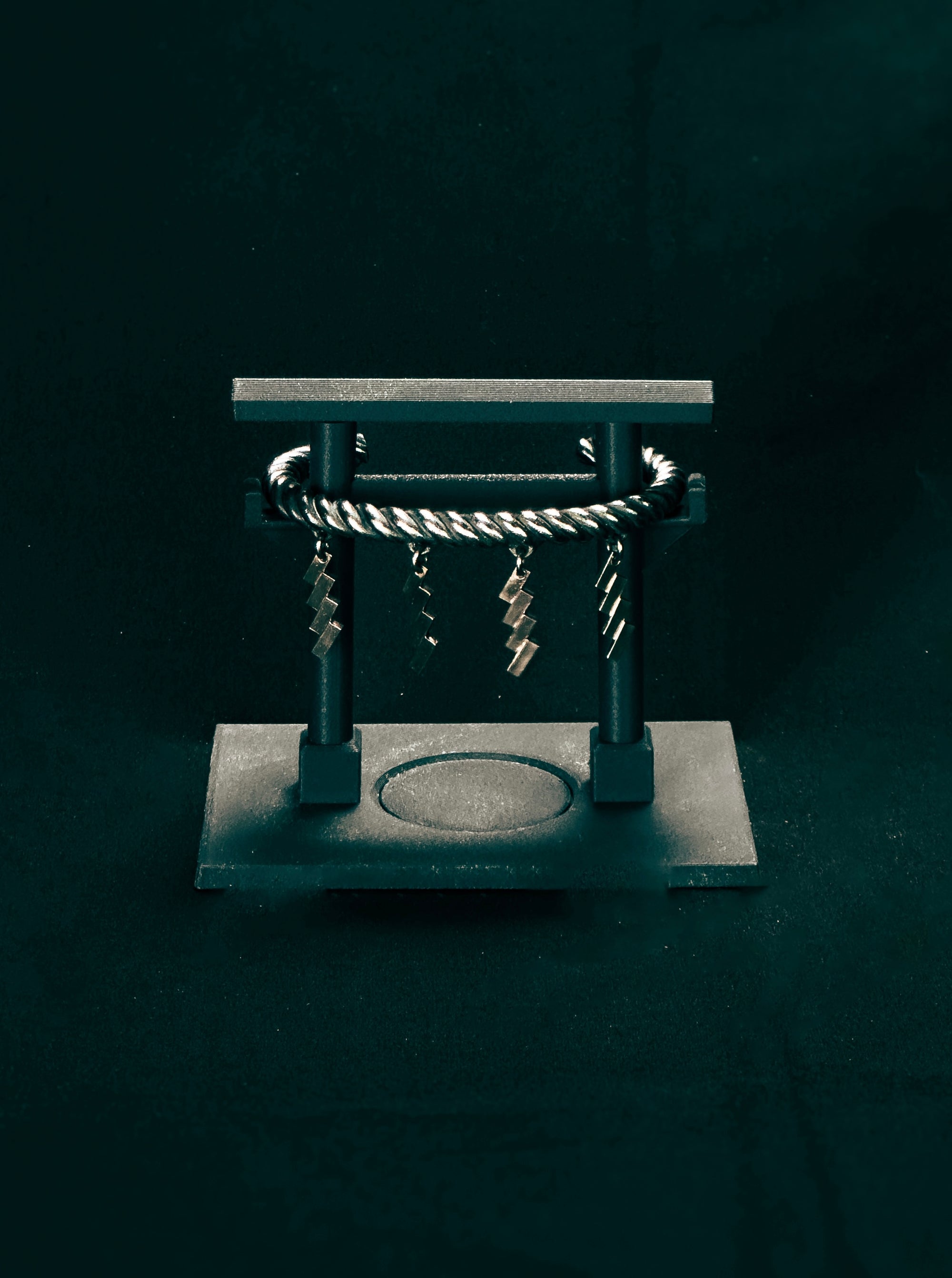 淺野屋健一では、オリジナルの腕輪の展示台も販売しております。しめ縄の腕輪シリーズ用の鳥居型展示台は消し炭色と赤x消し炭の二種類ご用意しております。アンクレット用は岩型の展示台もご用意しております。